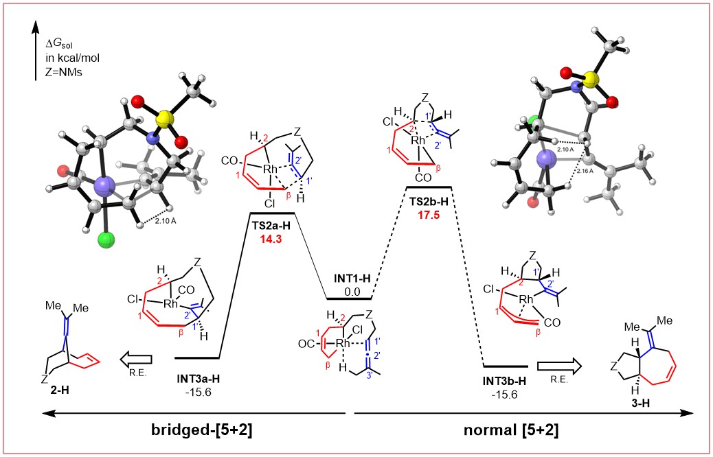 图 4.桥式- [5+2]和正常[5+2]反应的竞争(DFT计算结果)