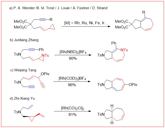 图2.使用过渡金属催化的[5+2]反应来构建七元环的方法学