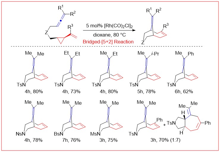 研究发现桥式-[5+2]反应的底物普适性较好,对于联烯的末端修饰两个取代基的底物均能够以很好的产率得到新型的桥式[5+2]反应的产物。而联烯的末端若仅有一个或者没有取代基,反应则难以发生。余志祥课题组认为在这种情况下铑催化剂会与外侧位阻较小的双键配位,从而使反应难以发生。这种“末端甲基效应(terminal methyl effect)”曾被Houk和Wender详细研究,并在之前很多关于联烯的研究中也被观察到。除了NTs桥的底物之外,NNs、NBs、NMs桥的底物也均能发生这种新型的桥式[5+2]反应。在以上的这些反应中,均只分离得到桥式的[5+2]反应产物。但是当底物的乙烯基环丙烷(VCP)部分存在取代基时,除了桥式的[5+2]反应产物,常规的[5+2]反应产物也能分离得到。