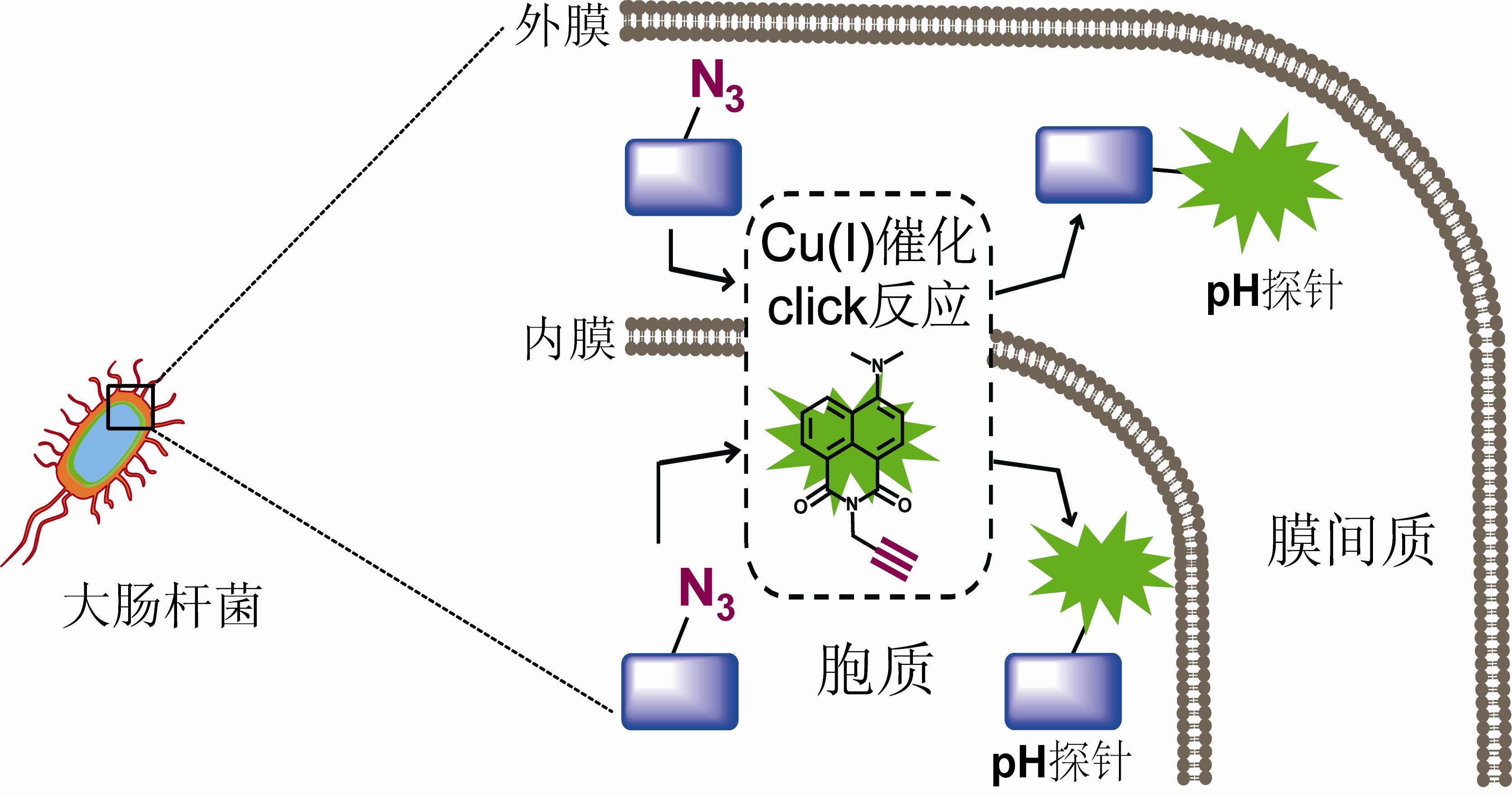 铜离子催化的叠氮-炔基环加成反应(“点击化学(click reaction)”)是标记生物大分子的重要手段。然而,由于一价铜离子的生物毒性,这类反应通常难以应用于活细胞内部的标记。陈鹏课题组最近在《自然-通讯》在线发表了题为“Biocompatible click chemistry enabled compartment-specific pH measurement inside E. coli”的研究论文(Nat. Commun. 2014, doi:10.1038/ncomms5981),利用铜催化的点击化学反应对大肠杆菌胞质内的蛋白质进行了特异标记。该工作还被美国化学会的官方杂志 “C&E News”进行了报道。