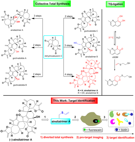 天然产物及其衍生物一直以来是创新药物的主要来源也是生物医学研究的重要工具分子。目前超过50%的临床应用药物都直接或间接来源于天然产物。因此针对具有重要生物功能的天然产物的合成及生物作用机制研究一直是科学界非常关注的方向。但由于天然产物的自然来源有限,且一般都具有复杂结构,导致其化学合成以及结构改造和修饰的超高难度。此外,由于目前还缺少足够高效的化学生物学研究手段,对于活性天然产物的生物靶点发现还存在巨大的挑战。雷晓光课题组一直致力于活性天然产物的全合成以及后继化学生物学研究。自2009年开始,他们先后完成了一系列具有重要抗肿瘤,抗炎活性的倍半萜寡聚体类天然产物的集体全合成(Org. Lett. 2010, 12, 4284;J. Am. Chem. Soc. 2012, 134, 12414; Chem. Sci. 2013, 4, 1163; J. Org. Chem. 2014, 79, 3289)。