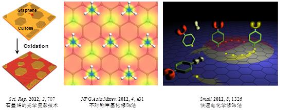 石墨烯是一种零帯隙二维半金属/半导体材料,通过表界面修饰可以对石墨烯的能带结构及其相应的光电特性进行调控,有利于实现其在未来的半导体器件领域中的应用。该课题组首先利用CVD生长的石墨烯和铜基底在界面的不同氧化特性,实现石墨烯的光学显影和高质量制备(Sci. Rep. 2012, 2, 707),并进一步发展了用甲烷等离子体对石墨烯进行不对称甲基化修饰(NPG Asia Mater. 2012, 4, e31: doi:10.1038/am.2012.58)和用电化学手段在温和条件下对石墨烯进行快速化学修饰的方法(Small 2012, 8, 1326),实现了对石墨烯的能带结构和导电性的调控。其中,改善石墨烯界面反应的电化学方法被德国威立出版社旗下的Materials Views作为亮点工作报道。