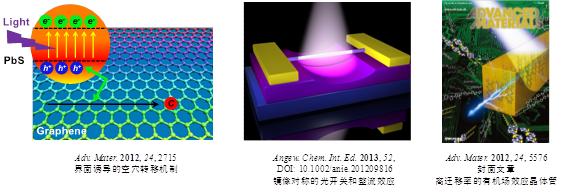 最近,该课题组结合量子点的尺寸效应制备了PbS/石墨烯复合材料,详细研究并揭示载流子在石墨烯/PbS异质界面上的传输机制(Adv. Mater. 2012, 24, 2715)。在这种界面调控的思想指导下,他们还构建了传统硅半导体材料(SiNWs)TiO2量子点间的异质界面,发现了光生载流子产生的两种竞争机制,实现了具有镜像对称关系的光开关和整流效应(Angew. Chem. Int. Ed. 2013, 52, DOI: 10.1002/anie.201209816)。在有机半导体器件领域中,他们从分子设计合成出发,分别大大改善了分子/基底和分子/分子间的接触界面,用溶液法制备出了具有高迁移率的有机场效应晶体管。部分工作发表在Adv. Mater. 上(Adv. Mater. 2012, 24, 5576),并被编委选为该杂志的封面文章。