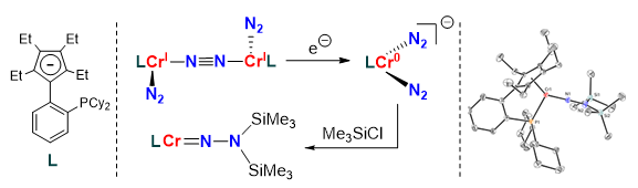 利用过渡金属与配体的协同效应是实现温和条件下氮气的高效活化与转化的途径之一。虽然该研究领域已经取得了一些重要进展,但是效率很低,反应机制不清楚。例如,已知铬与一些配体结合可以催化N2与Me3SiCl反应生成N(SiMe3)3,但是其反应的中间体未知,催化机理不详,限制了该催化反应的进一步优化和应用。本工作利用席振峰研究室自己发展的一类多功能膦-环戊二烯配体(Inorg. Chem. Front. 2019, 6, 428.),与Cr一起形成了结构新颖的多核Cr-N2配合物,并首次获得了其催化生成N(SiMe3)3的活性反应中间体。该工作为固氮化学中配体的设计,以及多功能配体与多核过渡金属协同作用于氮气分子的活化模式提供了一个新途径。