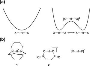氢键在物理、化学、生命科学和材料科学等自然科学中的重要性不言而喻。科学家在研究氢键的时候经常会涉及到氢键对称性的问题。在对称氢键中,质子处于两个相同的离子、分子或分子片的正中央,势能面上仅存在一个势阱(图1a;左)。对于非对称X−H···X氢键,双势阱势能面中的对称结构为过渡态(图1a;右)。图1b中给出了一些对称氢键的例子:对称N···H···N氢键存在于质子化1,6-二氮杂双环[4.4.4]十四烷(1)中;对称O···H···O氢键存在于马来酸氢盐(2)中;对称F···H···F氢键存在于氟氢化物中。考虑到C与N、O、F同周期且其电负性比H强,从理论上讲,对称C···H···C氢键也是有可能存在的。但是,文献中却鲜有关于对称C···H···C氢键的实验或理论研究。
