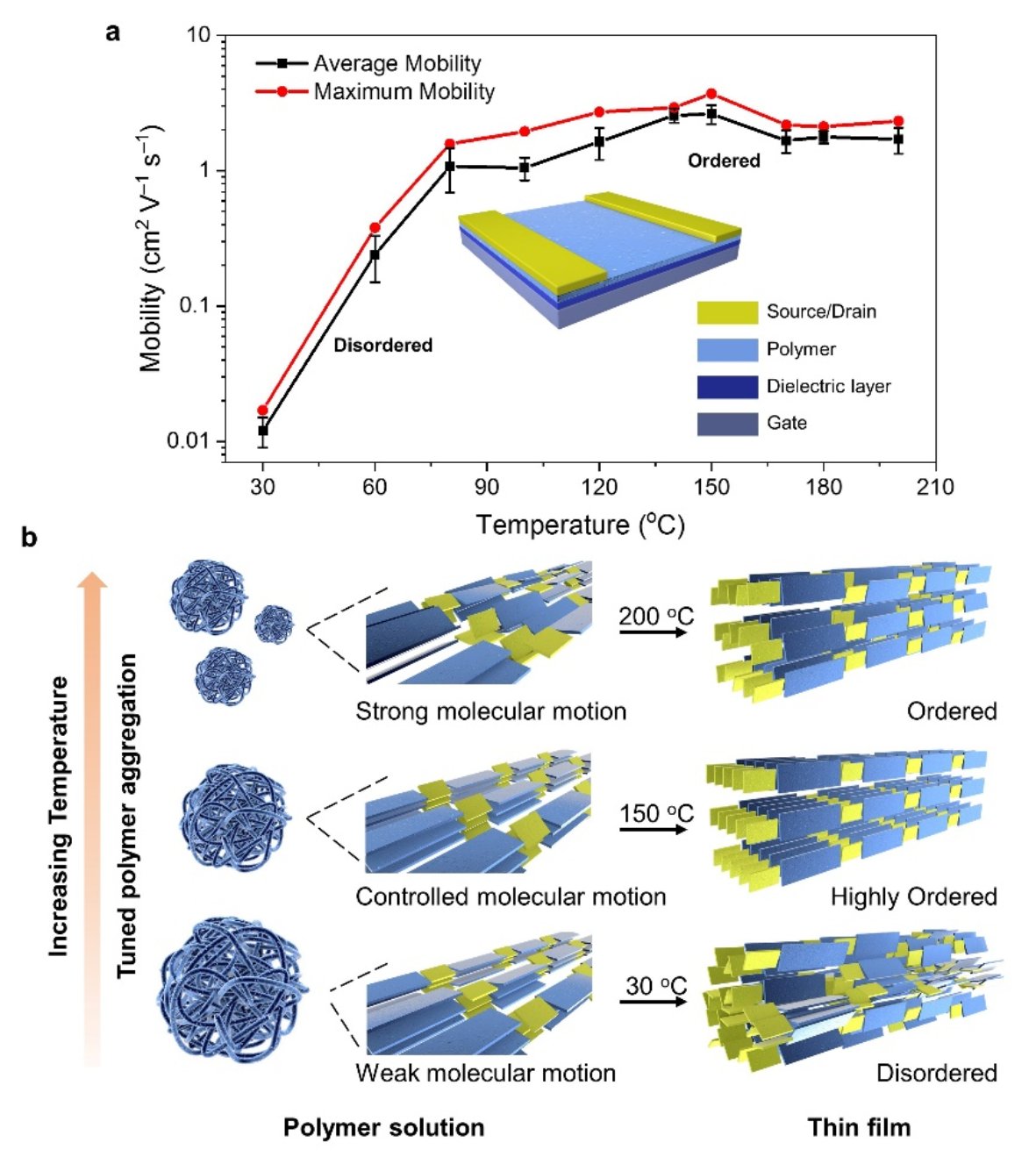 较低温度下,高分子在溶液中形成尺寸较大的聚集结构,其中高分子链的聚集较无序。无序的聚集结构则继承到薄膜中,形成无序的堆积结构。较高温度下,分子热运动一定程度上破坏了溶液中原本的较为无序的聚集结构。打破这些无序聚集结构可以帮助高分子链在结晶过程中形成更加有序的固相微结构 (图2)。