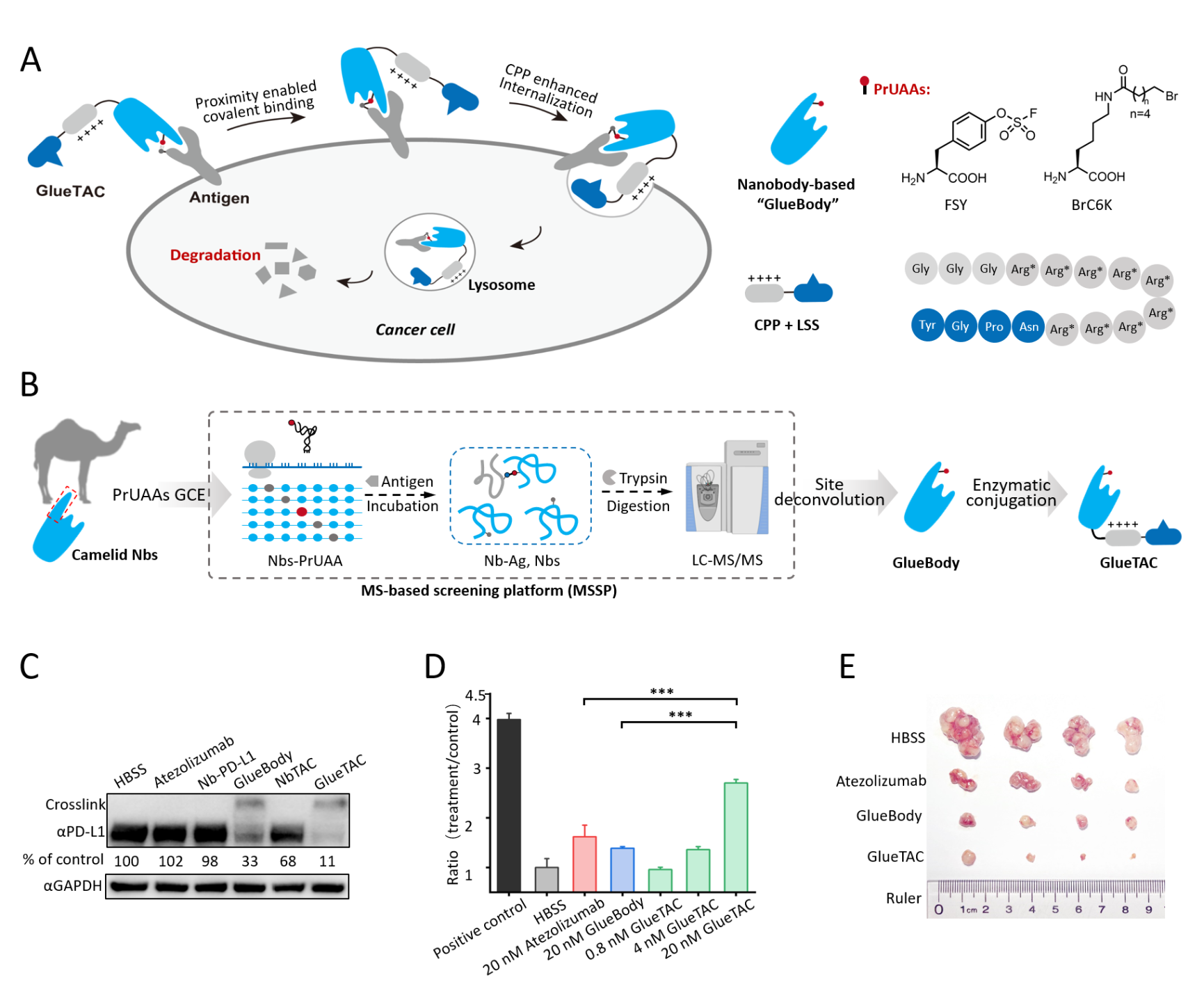 近日,3003新葡官方网站3003新葡官方网站陈鹏林坚合作团队报道了一种通用型的膜蛋白靶向降解技术(图2A作者首先开发了基于定量质谱的位点筛选策略(MSSP),结合遗传密码子拓展技术(GCE),得到了可以同PD-L1共价结合的胶水抗体,又称作GlueBodyGlueBody 的应用使得抗体、抗原间从非共价相互作用转变为共价结合,避免了膜蛋白降解子和膜蛋白复合物在内吞、降解的过程中可能发生的因解离带来的降解效率降低的问题。同时由于单域抗体结合抗原后的内吞过程到抗原、结合表位和所处微环境等多个因素的影响。为了内吞进程,作者通过酶催化反应高效地在共价抗体上添加了促进内吞和降解的细胞穿膜肽和溶酶体分选序列,最终得到膜蛋白靶向降解子——GlueTAC(图2B。随后的实验结果表明GlueTAC能够在包括肺癌、乳腺癌、黑色素瘤等多种癌细胞中快速介导靶蛋白PD-L1内吞和在溶酶体中的降解。与非共价降解嵌合体和单独的GlueBody相比,共价抗体促进内吞靶向功能肽降解效率都有着极为重要的作用,二者在组合中缺一不可(图2C。最后,作者进一步证明GlueTAC导的PD-L1的降解能够比单纯阻断PD-1/PD-L1相互作用更为高效、持久地激活T细胞和抑制肿瘤生长(图2D, 2E
