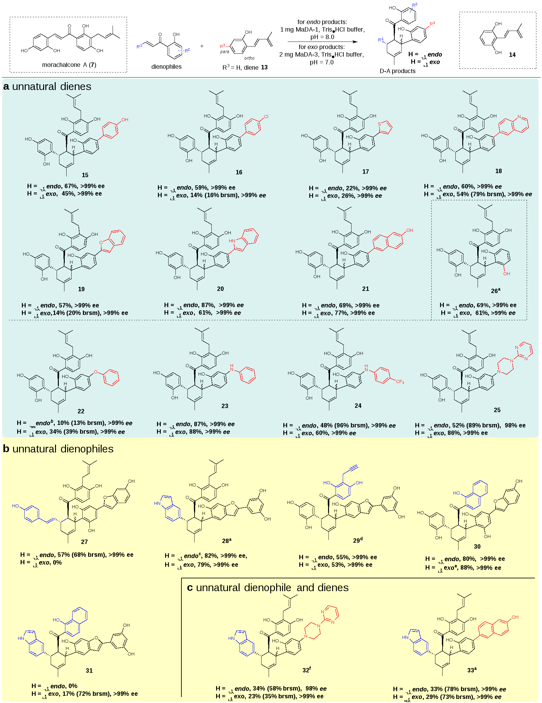 受到桑科植物中D-A类型天然产物生物合成的启发,作者从白桑中挖掘和鉴定到两FAD依赖蛋白,其中一类FAD依赖蛋白(MaDA-1)具有与已知endo选择性D-A反应酶MaDA相同的功能,另一类FAD依赖蛋白MaDA-2MaDA-3催化了罕见的exo选择性分子间D-A反应。作者还系统性探索了这两种选择性分子间D-A反应酶的底物适用范围,并利用它们实现了一系列天然和非天然D-A产物的高效精准合成,如1所示。