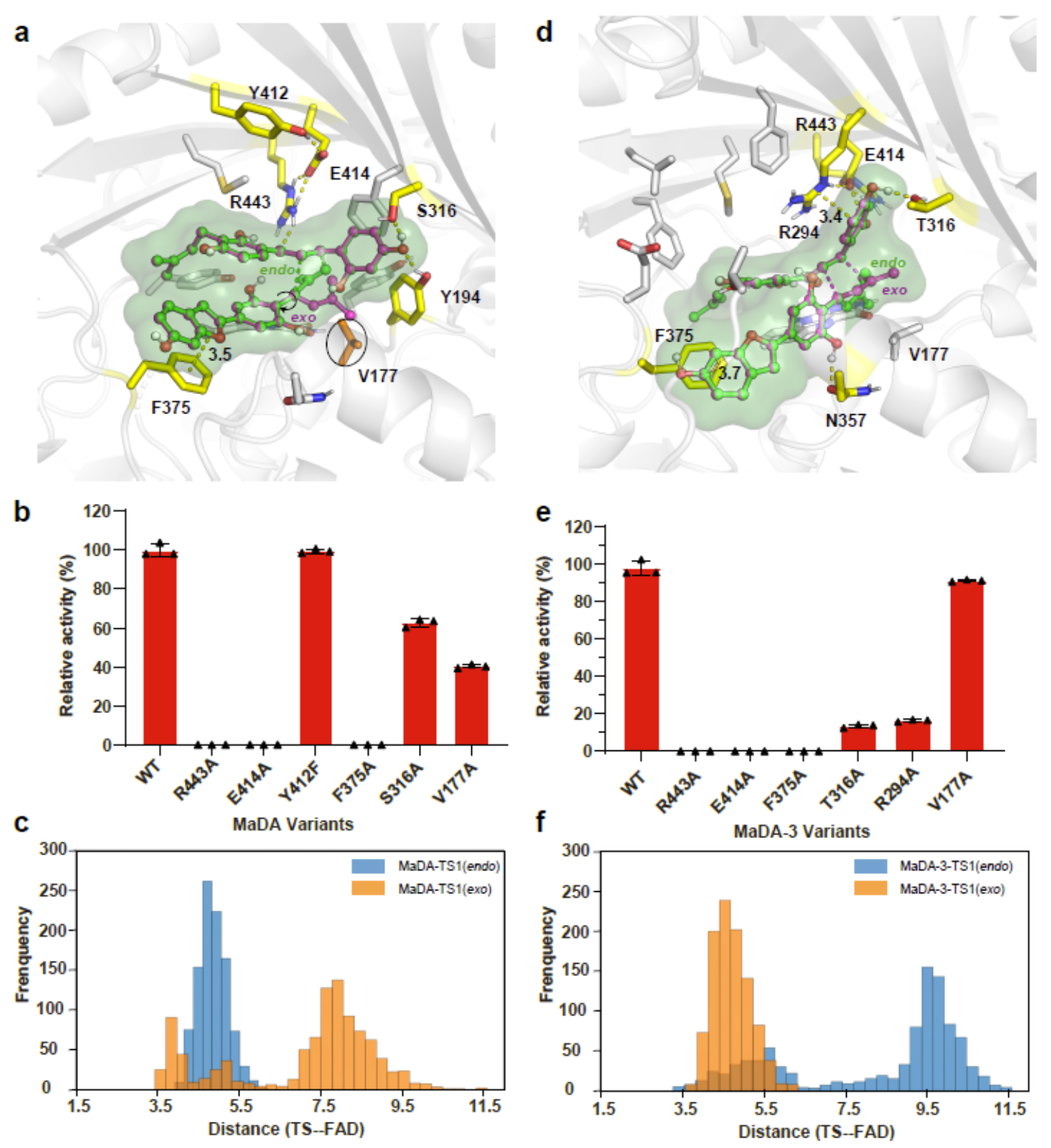 作者还成功解析了exo选择性D-A反应酶MaDA-3的晶体结构,并结合计算模拟以及突变实验解析了这D-A反应具有不同endo/exo选择性的机制。作者发现endo选择性D-A反应酶MaDA可以稳定结合endo过渡态而不能稳定结合exo过渡态(图2c;exo选择性D-A反应酶可以稳定结合exo过渡态而不能结合endo过渡态(图2f)。当endo过渡态与MaDA结合时,R443可以与亲二烯体形成较强氢键相互作用,从而促进了反应的发生(图2a;而在MaDA-3R294可以与亲二烯体形成较强的cation-相互作用,从而促进了反应的发生(图2d