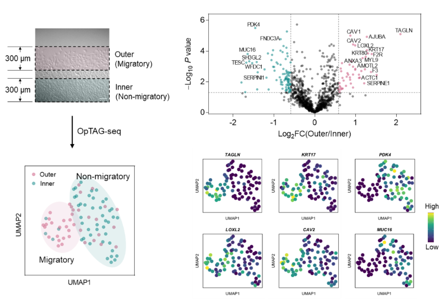 作者随后将OpTAG标记,流式分选与单细胞测序结合,发展了一种新的空间分辨单细胞测序技术OpTAG-seq。作者利用OpTAG-seq探究了癌症迁移过程的基因表达调控。在体外构建的癌细胞迁移模型中,作者分别对外部具有高迁移活性和内部的癌细胞进行OpTAG-seq分析。结果显示,这两部分细胞在降维分析中具有明显的分界,说明其基因表达具有较大差异。作者鉴定到许多在高迁移活性细胞中上调或下调的基因。其中,上调的这些基因显著地富集在细胞迁移和细胞运动等功能条目中。作者对其中两个靶标进行了免疫荧光验证,发现KRT17显著地在外部细胞高表达,而MUC16则在内部细胞高表达,与测序结果高度一致。此外,作者还成功利用OpTAG在小鼠肾脏切片中对不同区域进行高效荧光标记,证明这一方法在组织层面也具有广阔的应用前景。以上结果说明OpTAG-seq能够有效地实现空间分辨单细胞转录组测序,为研究细胞和组织中基因表达的时空调控提供了有力的化学工具。