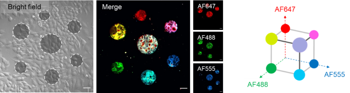 为了实现高空间分辨率的细胞标记,作者设计并合成了光激活探针ONPF,并基于其开发了光控细胞标记策略OpTAG。在紫外光照射下,ONPF转化生成具有极强反应活性的亚甲基苯醌中间体。在活细胞表面,中间体能快速地与细胞膜上的蛋白质等亲核试剂进行共价连接。作者在探针上引入生物素报告基团,利用荧光修饰链霉亲和素对标记进行表征。作者证明这一探针能够在活细胞表面实现很高空间分辨率的标记。通过多轮标记和颜色组合,OpTAG最多可以在一份样品中同时实现7个位置的标记,且标记的空间分辨率可以达到单细胞水平