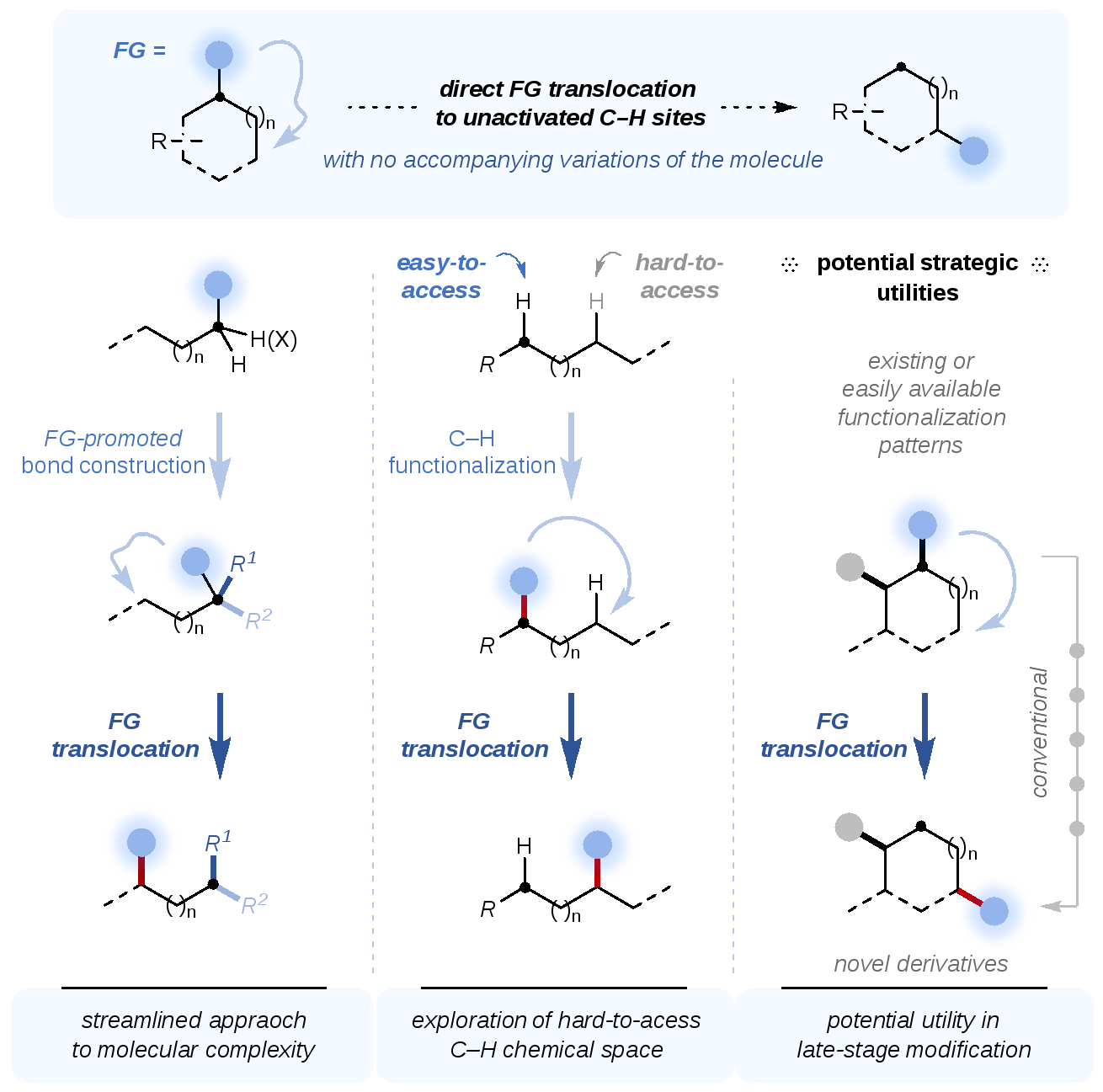 作为该课题组围绕这一新型碳氢转化策略的首篇工作,许言课题组在这项研究中成功实现了一类重要官能团——氰基——的普适性官能团直接转位反应。这一新颖转化除了将官能团移动至分子远端的一个非活化碳氢位点之外不对反应底物作任何其他改变,代表了一类此前研究较少、具有独特探索价值的反应类型。反应模式层面,这类官能团转位反应和常见的官能团转化反应构成一定互补:后者常常只改变官能团的类型而不改变官能团的位置;而前者则不改变官能团的类型,只调整其在分子中所处的位置。这类反应同时具有高原子经济性(反应前后分子式不变)和氧化还原中性特点,并具有独特的潜在合成学价值,例如有望1)提供分子骨架快速构建的新策略,2)拓展碳氢官能化可有效触及的化学空间,3)应用于天然或易得官能化骨架的后期修饰等(图2)。