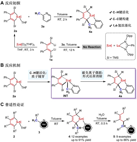 当脒基镥杂环戊二烯2a与2-甲基吡啶3a反应时,他们意外地得到了CC交叉偶联产物4a(图2A)。从2a到4a,发生了CH键活化及CC键偶联,可看作是镥杂环戊二烯的1,4-氢烷基化过程。考虑到稀土碳键的强极性,通过键复分解的CH键活化是常见的。然而,根据前面的分析,CH键活化之后的CC偶联却是意料之外的。面对这一令人困惑的问题,他们进行了详细的机理实验和理论计算。首先,氘代标记实验证明了吡啶苄位CH键对丁二烯骨架的加成。随后,通过动力学同位素效应(KIE)的测定,发现该反应在298 K下具有较大的KIE(14.3),这表明反应的决速步为CH键活化;同时,通过研究KIE与温度的关系,发现CH键活化步骤存在质子隧穿效应。进一步的计算表明反应主要经历了两步:1)经由四元环过渡态的CH键活化得到中间体INT,这一步是决速步;2)中间体INT中的两个碳负离子偶联,发生形式上的还原消除反应得到产物4a(图2B)。他们还对交叉碳负离子偶联步骤进行了主作用轨道分析(PIO)。在碳负离子偶联时,电子流向了镥与二烯的组合轨道,这反映了二烯片段既是偶联组分,又作为电子储存体。二烯骨架上的取代基,氮杂芳烃的种类,氮杂芳烃上的取代基和取代模式均可调,表明稀土中心上的交叉碳负离子偶联这一关键基元反应具有好的普适性。