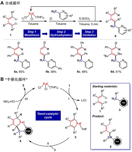 最后,他们实现了稀土介导的1,4-二锂-1,3-丁二烯1与2-烷基吡啶偶联制备吡啶苄位二烯化产物6的一锅三步合成循环(图3A)。其中,多种不同取代基的双锂化合物均能以中等收率得到最终产物,同时以较高的收率回收脒基二氯化镥。类似地,还开发了用于氮杂芳烃苄位烯丙基化的“半催化”循环,以1a和3a作为模板底物,一锅内循环三次后,能以71%的总收率得到目标产物(图3B)。合成循环和“半催化”循环的开发,表明稀土中心上的交叉碳负离子偶联具有潜在的合成应用。