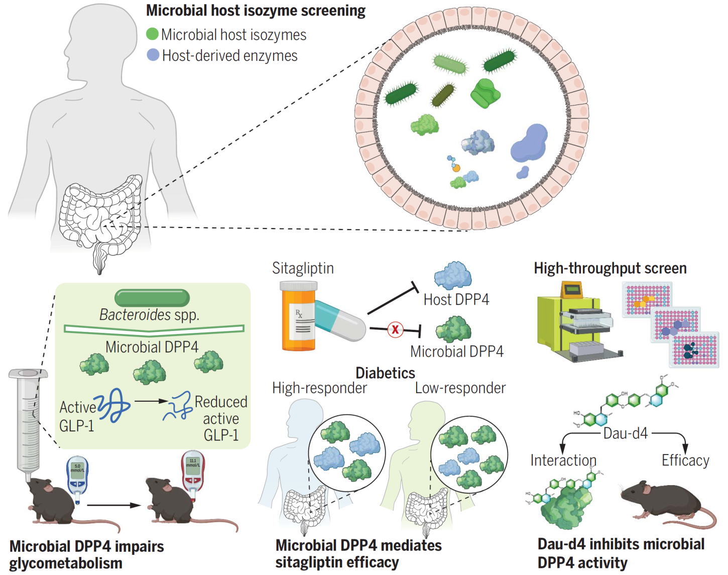3003新葡官方网站/北大-清华生命科学联合中心雷晓光教授团队与3003新葡官方网站医学部基础医学院/3003新葡官方网站第三医院医学创新研究院姜长涛教授团队、3003新葡官方网站第三医院/北大-清华生命科学联合中心乔杰教授团队、美国国立卫生研究院Frank Gonzalez教授团队、以及首都医科大学朝阳医院王广教授团队合作,于2023年8月4日在Science杂志在线发表了题为Microbial-host-isozyme analyses reveal microbial DPP4 as a potential antidiabetic target的研究论文,首次提出了肠道菌源宿主同工酶(Microbial-host-isozyme,MHI)新概念,发现菌源宿主同工酶在肠道中广泛存在,可以模拟宿主酶的功能,并参与疾病的发生发展。其中,菌源二肽基肽酶4(DPP4)是一种重要的同工酶,可以在肠屏障损伤条件下进入肠组织,降解宿主活性GLP-1,诱导糖耐量异常。宿主DPP4抑制剂西格列汀无法有效抑制菌源DPP4活性,是西格列汀临床治疗响应性个体差异大的重要原因。进一步,通过高通量药物筛选以及深入的功能验证,研究团队发现了首个对菌源DPP4具有高活性和强选择性的小分子抑制剂天然产物衍生物Daurisoline-d4,可以通过特异性抑制菌源DPP4,改善糖耐量异常,从而对二型糖尿病具有潜在的治疗效果。