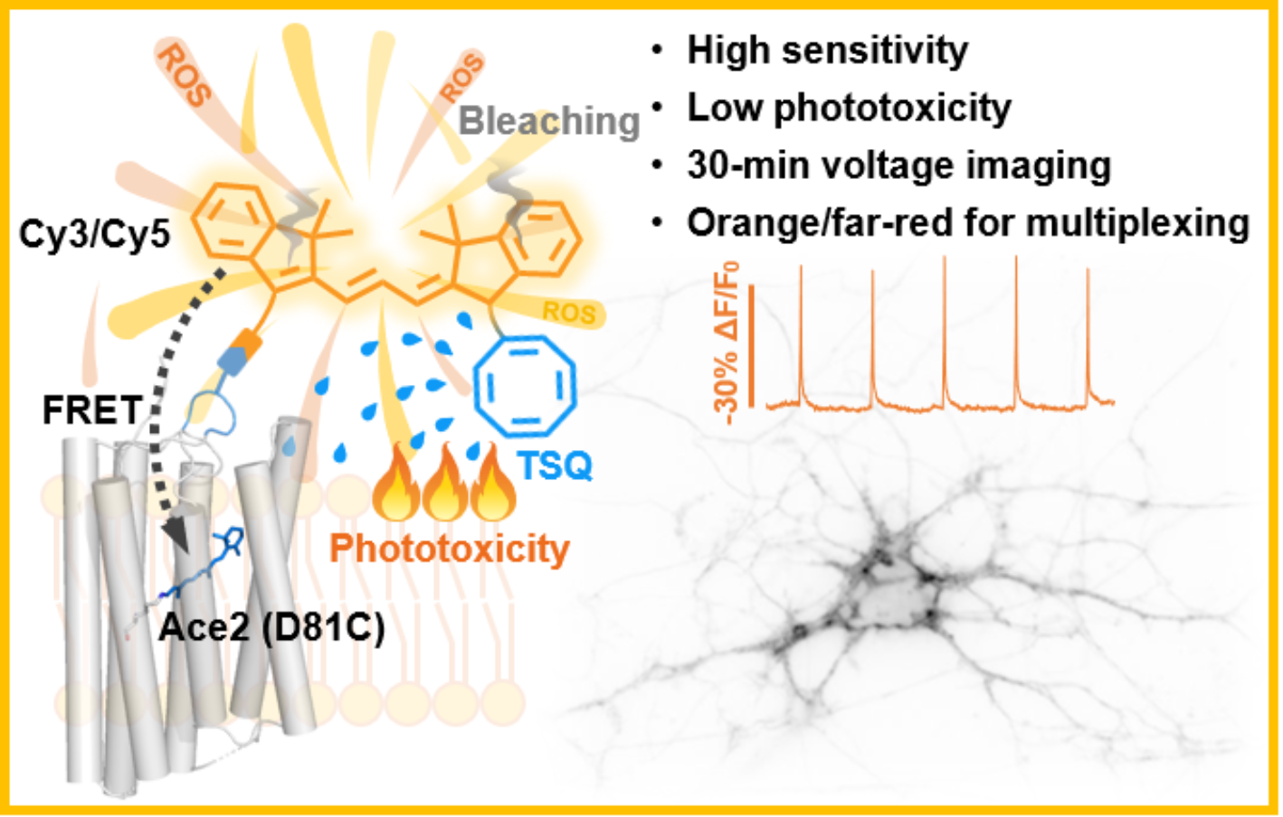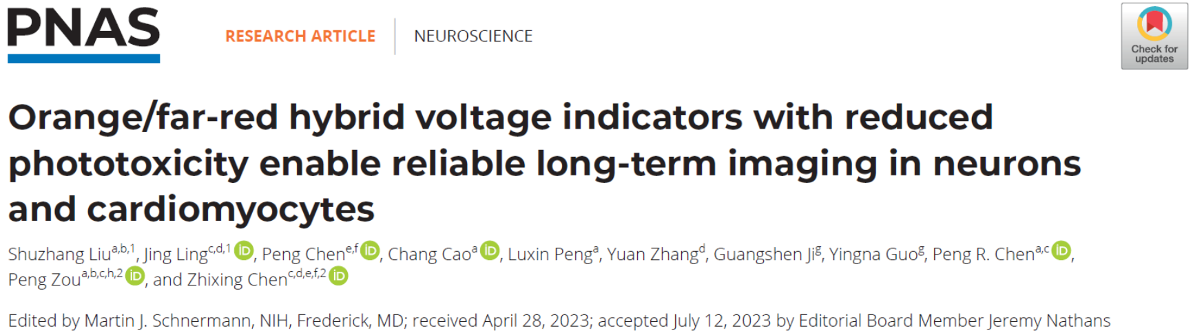 2023年8月17日,3003新葡官方网站生命科学联合中心的陈知行课题组和邹鹏课题组在Proc. Natl. Acad. Sci. U.S.A.杂志在线发表了最新合作研究成果“Orange/far-red hybrid voltage indicators with reduced phototoxicity enable reliable long-term imaging in neurons and cardiomyocytes”,他们合成了光稳定性良好的环辛四烯(COT)修饰的花菁染料,搭配灵敏度优异的复合型膜电位探针HVI(hybrid voltage indicator),将其升级为新一代低光毒性探针。其中,橙色荧光探针HVI-COT-Cy3 可对神经元进行持续30min的膜电位记录,还能有效鉴定药物对神经元和心肌细胞电生理的影响;此外,远红色探针HVI-COT-Cy5可与绿色荧光探针联用,实现神经膜电位与钙信号连续15 min的并行检测。