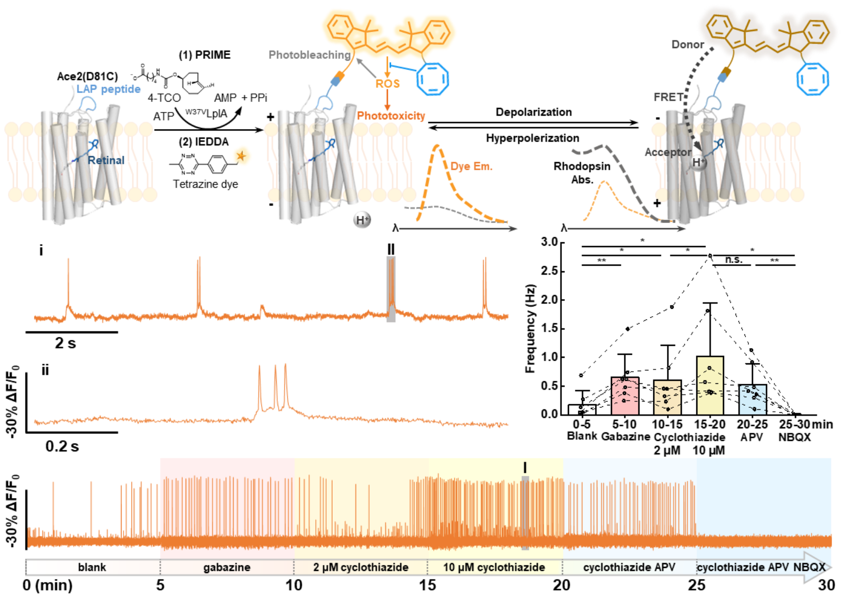 揭开大脑奥秘的关键在于解析细胞间的通讯机制,特别是神经电活动信号的传导。相较于传统膜片钳技术,利用成像方法记录细胞膜电位具有高通量、非侵入式等优势,逐渐在检测可兴奋细胞电信号的时空动态变化方面崭露头角。基于电压敏感蛋白质与小分子荧光染料复合型结构的荧光膜电位探针,在电压灵敏度、光稳定性和细胞特异性等方面展现出明显优势,极大地促进了光学成像在检测神经活动方面的应用。