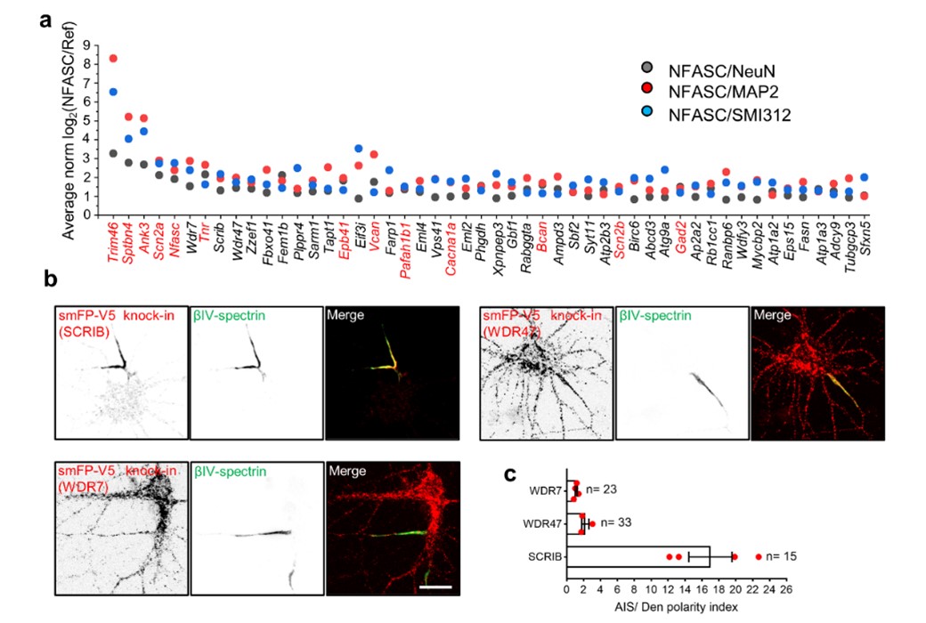 随后,作者以多个神经元亚细胞结构(包括细胞体、树突、轴突等)作为空间参照,通过10重TMT肽段标签并结合定量比率蛋白质组学扣除背景信号和参照信号,最终获得了高质量AIS蛋白组数据。数据分析表明,捕获到的1403个蛋白质几乎涵盖了所有已报到的AIS分子(图1),包括胞外基质蛋白、AIS膜蛋白及各种电压门控离子通道蛋白和细胞骨架相关蛋白等。其中,目前已知的AIS高表达分子AnkG、TRIM46、NFASC、Nav1.2和βIV-spectrin处在数据列表前5的位置。至此,作者获得了成熟神经元AIS高覆盖度的蛋白质数据列表。