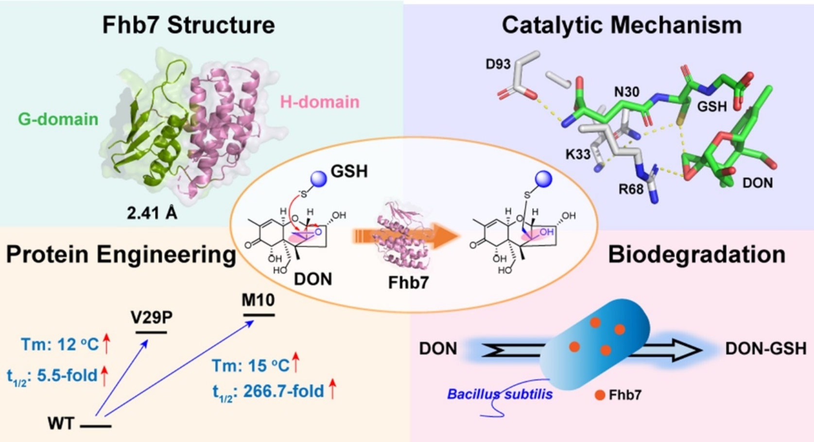 酶因其高效、反应条件温和、环保等多方面的优势,使其受到众多研究者的青睐。虽然目前已有多个能够降解呕吐毒素的酶被发现,但尚未有酶被成功用在实际工业中。并且,目前已发现的所有降解酶都针对DON的3-OH,C9=C10进行氧化、乙酰化、糖基化等修饰实现DON毒性减弱,但是并未有能够转化其主要致毒的C12/C13环氧基团实现DON解毒的酶被发现。直到2020年4月,山东农业大学孔令让教授课题组在Science上报道了在小麦种质资源中可用的主效抗赤霉病基因Fhb7,引发了国际学术和农业界的广泛关注(Science2020368, eaba5435)。Fhb7编码一种谷胱甘肽转移酶,能够利用谷胱甘肽破坏关键致毒C12/C13环氧基团实现DON的降解,这也是首个被报道的能够破环DON环氧的酶,从而打开了酶法降解呕吐毒素的新思路。然而,针对Fhb7的催化机制、热稳定性等性质尚不清楚,极大地限制了对其工业价值的进一步开发和利用。
