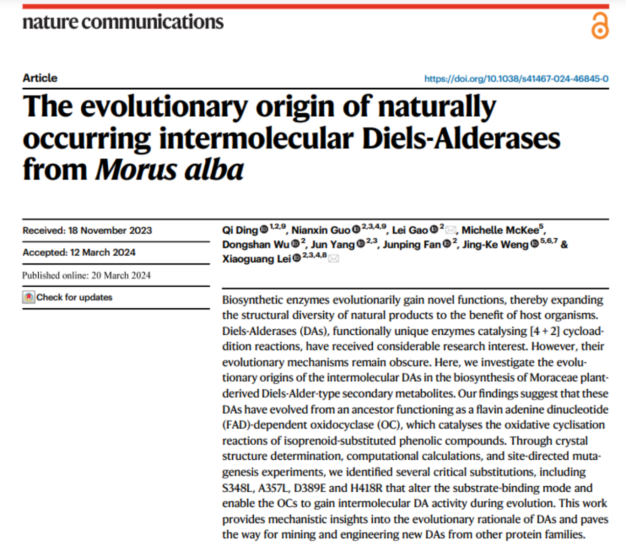 该工作以“The evolutionary origin of naturally occurring intermolecular Diels-Alderases from Morus alba”为题,在《Nature Communications》期刊上发表(DOI: 10.1038/s41467-024-46845-0)。自1928年Diels-Alder反应被首次报道以来,尽管众多科学家在过去的几十年里致力于对该反应的生物合成酶进行深入的挖掘和鉴定,但所发现的D-A酶数量仍然寥寥无几。这项关于D-A酶演化机制的重要研究为未来D-A酶的挖掘和改造提供了新的思路和方向,为生物合成和化学合成领域的发展注入新的活力。同时该研究也为深入理解植物天然产物的生物合成途径与自然进化提供了重要思路。