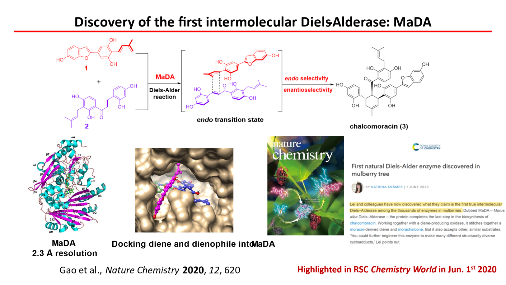 在实验室的前期探索中,雷晓光课题组首次在非模式植物白桑中鉴别出两种具有不同endo/exo选择性的分子间D-A酶,并对这些酶的催化机制进行了详尽而系统的研究,相关成果已相继发表在《自然·化学》和《自然·催化》等期刊上(Nature Chemistry 2020, 12, 620–628; Nature Catalysis 2021, 4, 1059–1069)。基于这些前期的研究,该团队进一步观察到,来源于桑科植物的分子间D-A酶MaDA与二烯体合成酶MaMO在序列和结构上展现出了显著的相似性,两者均归属于FAD偶联氧化酶家族中的类BBE酶亚家族。然而,令人惊奇的是,尽管大多数类BBE家族的酶主要催化氧化反应,但D-A酶却催化非氧化反应,这一特性暗示MaDA酶很可能是该家族中一个具有新功能化的成员。这点引发了研究者的浓厚兴趣。