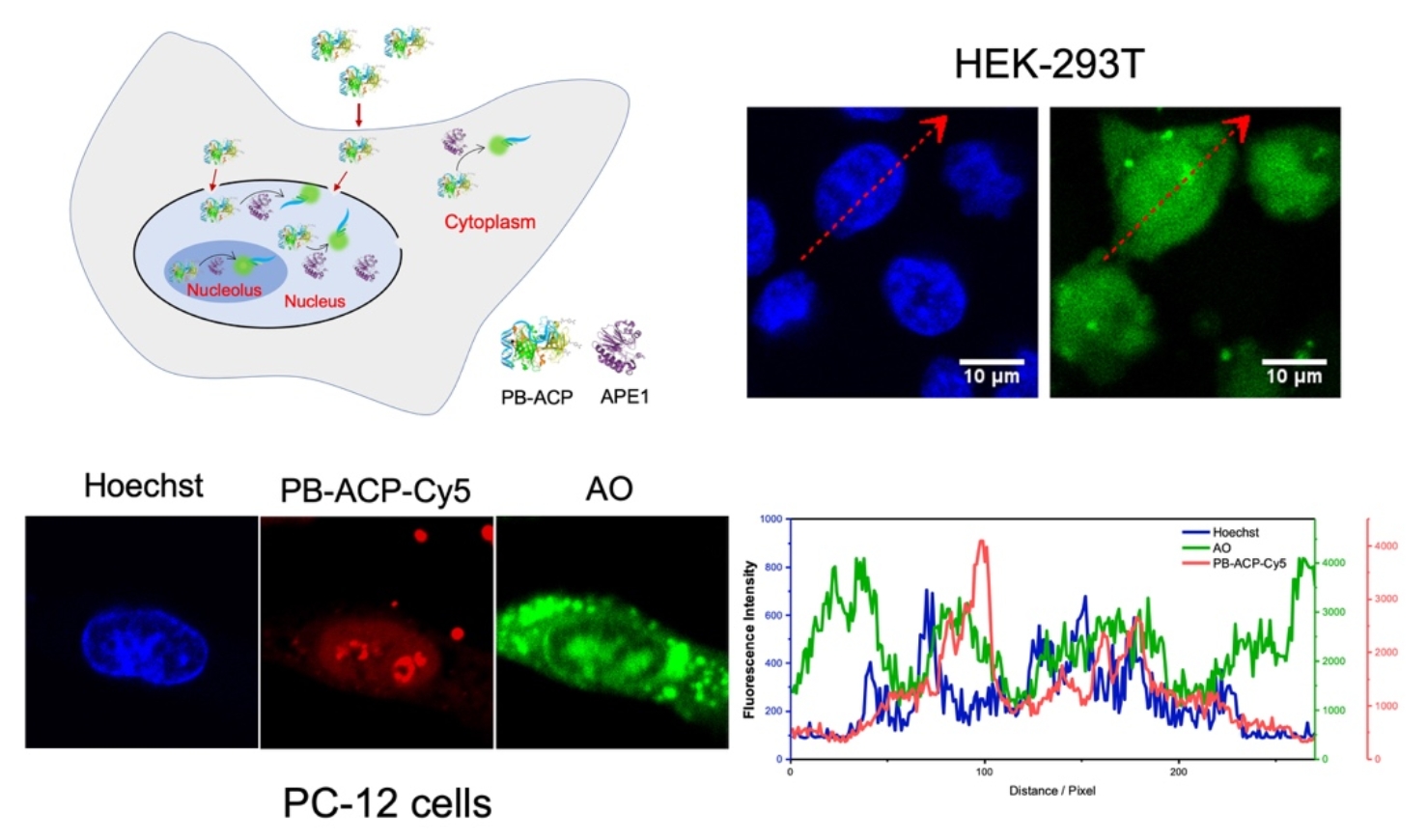 图2. 由苯硼酸修饰亲和素构建的分子伴侣@DNA荧光探针(PB-ACP)及其在不同类型活细胞的细胞核内对内源APE1的荧光响应。