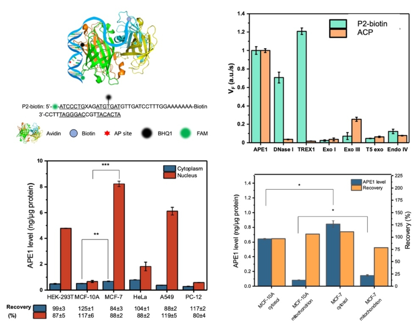 图1. ACP荧光探针的构建、选择性和对不同类型细胞的细胞器中APE1的定量测定。