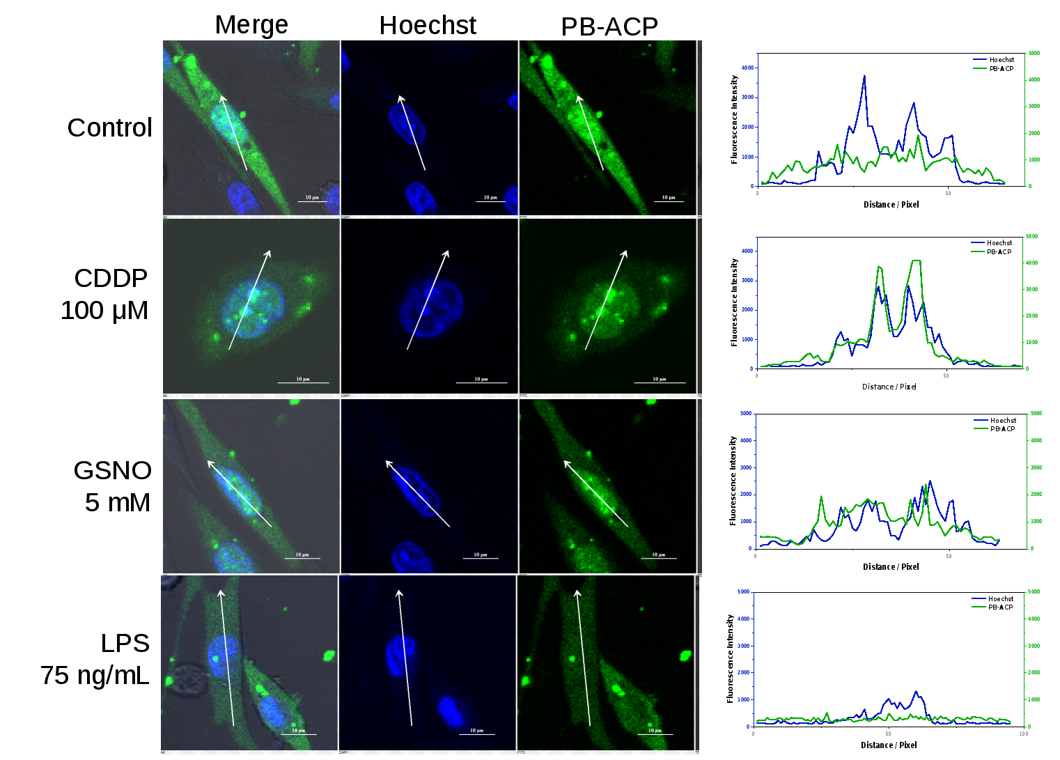 作者进一步用苯硼酸衍生物共价修饰AVD,制得的探针(PB-ACP)通过输入蛋白α/β途径靶向细胞核的能力在多种细胞系中都得到了证实(图2)。研究揭示出APE1在基因表达活跃和DNA损伤程度较高的常染色质区域活性较高,在核仁区有明显的分布,而在异染色质区分布相对较少。