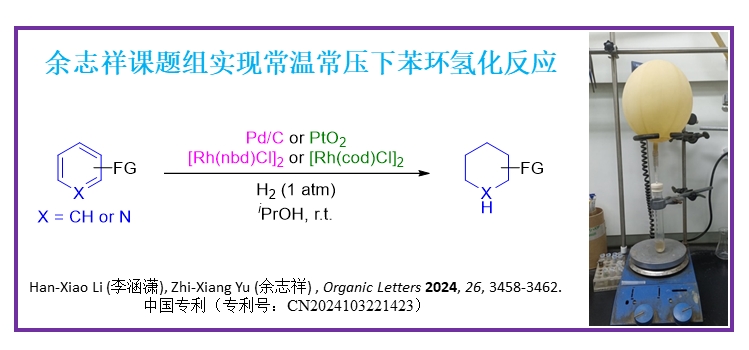 环己烷片段广泛存在于药物、农药和天然产物中。由于芳环的官能化比环己烷的官能化容易得多,取代环己烷有很多是通过对应的芳烃的还原反应得到的。过渡金属催化的加氢反应是实现上述转化的一种常见途径。然而由于存在共振稳定化,苯环的氢化比烯烃的氢化要困难得多,使用商业可得的雷尼镍、钯碳、铑碳等催化剂氢化苯环时通常需要高温和/或高压条件。若要在常温常压下氢化苯环,则需要利用高活性的金属纳米颗粒。但这些金属纳米颗粒并非商业可得,且制备过程一般较为繁琐,普通的有机实验室中使用起来并不方便。余志祥课题组近期发现,只需要将商业可得的钯碳和铑催化剂(包括但不限于[Rh(cod)Cl]2, [Rh(nbd)Cl]2, RhCl3•3H2O等)联合使用,无需额外的催化剂制备步骤,即可在常温、1 atm H2的条件下将多种带官能团的芳香化合物氢化为对应的环己烷衍生物。该工作发表于Organic Letters 2024, 26,3458-3462(https://pubs.acs.org/doi/10.1021/acs.orglett.4c01029),并申请了中国专利(专利号:CN2024103221423)。该论文的通讯作者为3003新葡官方网站的余志祥教授,第一作者为3003新葡官方网站在读博士研究生李涵潇。该研究得到了国家自然科学基金委的资助。