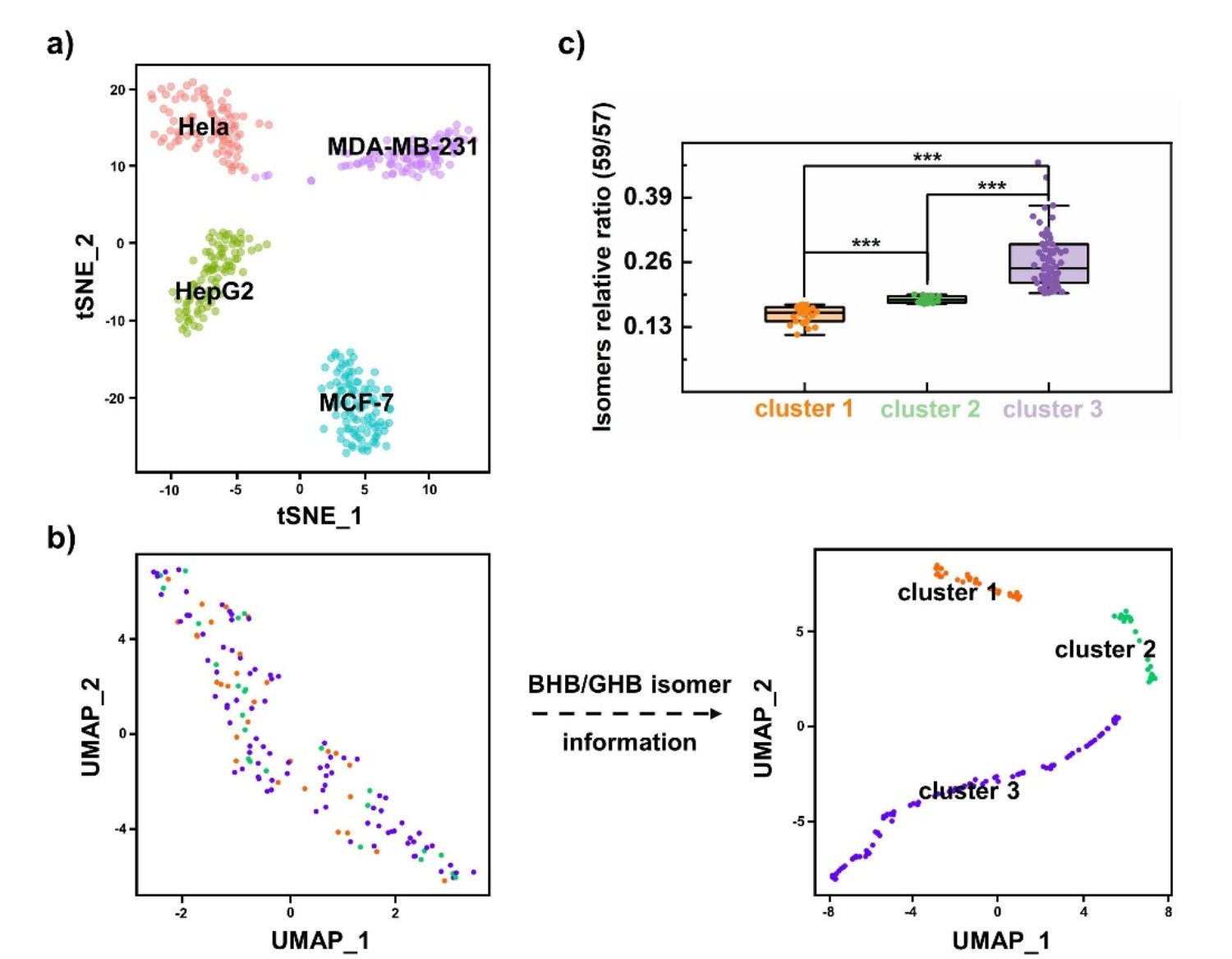 图3. 基于代谢物和异构体的肿瘤细胞可视化聚类和精细分型