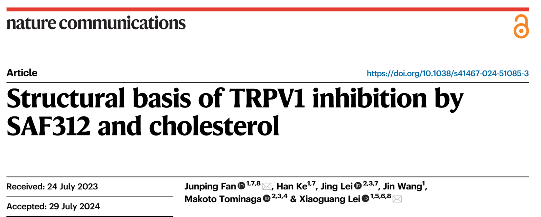 该工作是雷晓光团队继前期发表的TRPV家族离子通道蛋白TRPV3(Nature Chemical Biology 202319, 81-90),TRPV4 (Advanced Science 202411, e2401583)后,在靶向离子通道蛋白的结构药理学和药物化学生物学方向上做出的又一重要科研成果。该工作近日以“Structural basis of TRPV1 inhibition by SAF312 and cholesterol”为题发表于国际期刊Nature Communications