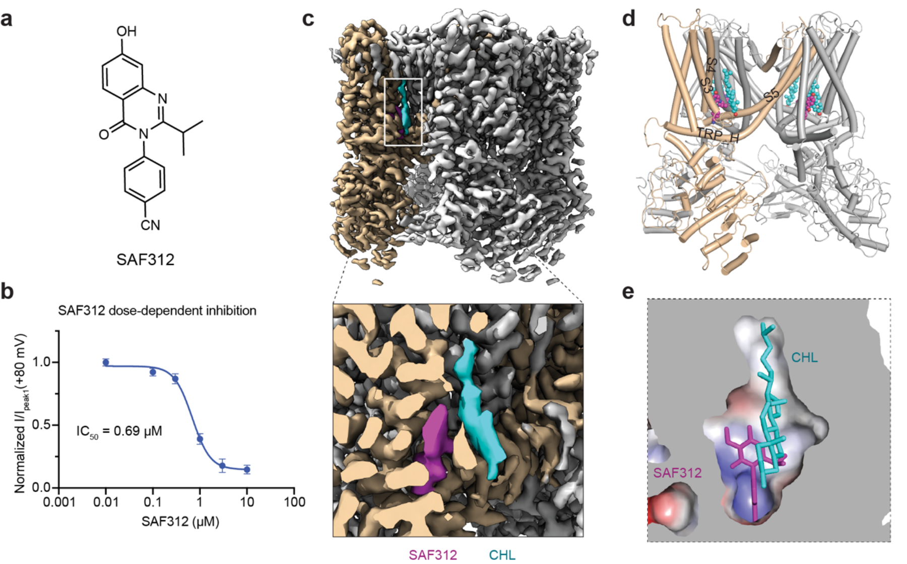 SAF312 是一种高效、选择性的TRPV1小分子拮抗剂;目前诺华制药公司正在临床二期试验中评价该候选药物在术后眼部疼痛的治疗中的效果,且达到了临床预期,有望成为最新一代靶向TRPV1,用于治疗术后疼痛的“first-in-class”小分子药物。然而,SAF312抑制TRPV1 的机制仍不完全清楚。3003新葡官方网站雷晓光团体近些年致力于靶向离子通道蛋白和疼痛治疗的药物化学生物学研究。为了深入理解SAF312的结构药理学基础,帮助开发更为有效的止痛药物,该团队解析了人源TRPV1与SAF312的复合物冷冻电子显微镜结构,阐明了其对TRPV1拮抗效应的结构基础。SAF312结合于香草素结合口袋,阻止了对于通道门孔至关重要的S4和S5螺旋的构象变化。出乎意料的是,团队还发现内源的胆固醇参与了SAF312的抑制作用。研究团队通过结合点突变验证、钙成像、电生理和分子动力学模拟等,揭示了SAF312抑制TRPV1的重要机制,并阐释了拮抗剂SAF312与胆固醇在调控TRPV1功能中的协同作用。该工作不仅扩展了对SAF312抑制TRPV1的机制理解,也为进一步开发和优化与TRPV1相关的药物研发提供了指导。