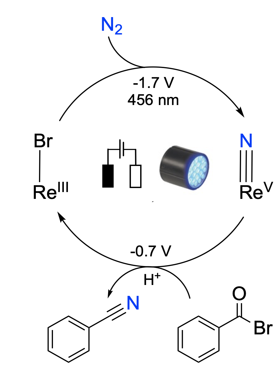 The direct use of N2 for the synthesis of nitrogenous organic products, such as amines, nitriles, or nitro compounds, is still challenging and catalytic protocols remain unknown. The reductive splitting of dinitrogen into transition metal nitrido complexes represents a potential entry towards N2 fixation beyond ammonia.[1] Over the past years, our group examined the mechanisms of chemically, photochemically, and electrochemically driven reductive N2 splitting by group 6 and 7 metal complexes as a starting for the transformation of dinitrogen to nitrogenous products, like organic nitriles (see Figure).[2]