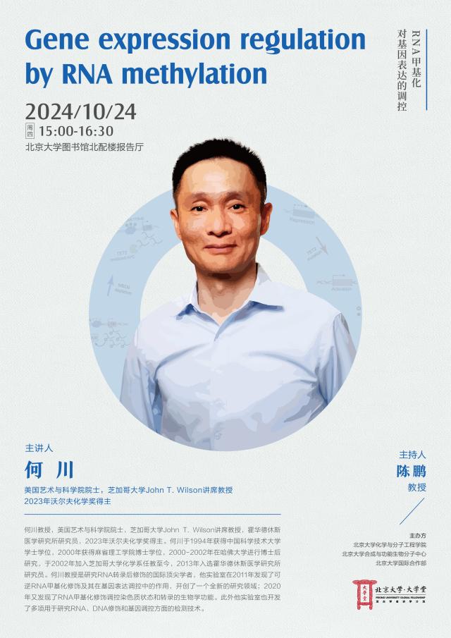 美国艺术与科学院院士,芝加哥大学John T. Wilson讲席教授,霍华德休斯医学研究所研究员,2023年沃尔夫化学奖得主。何川于1994年获得中国科学技术大学学士学位,2000年获得麻省理工学院博士学位,2000-2002年在哈佛大学进行博士后研究,于2002年加入芝加哥大学化学系任教至今,2013年入选霍华德休斯医学研究所研究员。何川教授是研究RNA转录后修饰的国际顶尖学者,他的实验室在2011年发现了可逆RNA甲基化修饰及其在基因表达调控中的作用,开创了一个全新的研究领域;2020年又发现了RNA甲基化修饰调控染色质状态和转录的生物学功能。此外他的实验室也开发了多项用于研究RNA、DNA修饰和基因调控方面的检测技术。