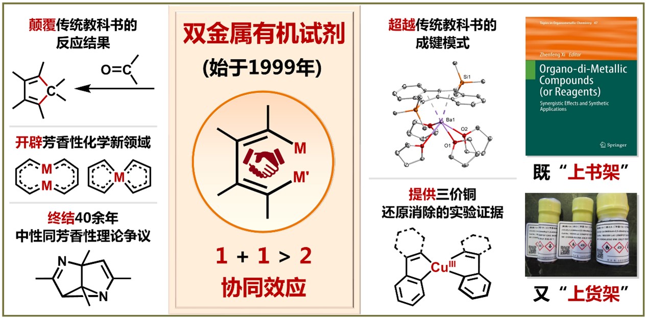 合成试剂的创制与应用极大地推动了合成化学及化学工业的发展。席振峰教授团队1999年发现含有两根碳-金属键的双金属有机试剂与传统金属有机试剂反应性截然不同,随后历经20余年的探索,发展了包括双锂试剂在内的多种双金属有机试剂,揭示了其不同于单金属试剂的反应机制,及其分子内和分子间“1+1大于2”的协同效应,实现了氮杂半瞬烯、金属杂芳香环、三价铜配合物等其他方法不能实现或难于实现的重要物质的合成,构建了超越传统教科书的成键模式,开辟了芳香性化学的新领域。