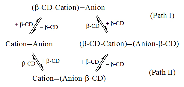 Scheme 1. Two-step equilibrium in an IL/b-CD system. Path I: the cation interacts with b-CD more strongly than the anion does. Path II: the anion interacts with b-CD more strongly than the cation does.