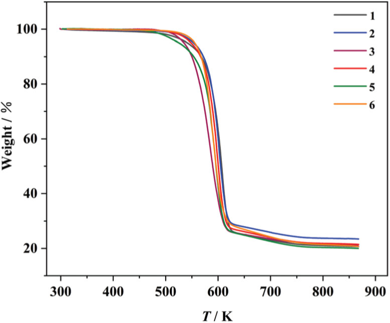 MIL1-6通过三个步骤合成,通过电喷雾电离质谱(ESI-MS)、元素分析(EA)和红外光谱(IR)对其进行表征,表明MILs的成功合成。为了评估这些MIL的热稳定性,使用热重分析(TGA)确定了分解温度。发现这些MIL由于相似的化学结构而显示出相似的一步式重量损失曲线,并且在低于573 K时具有良好热稳定性。通过差示扫描量热法(DSC)测定这些化合物的玻璃化转变温度(Tg)MIL1-6的Tg值分别为242.1、243.0、242.3、240.6、237.9和239.1K。因此,所有MIL均在室温下呈液态。