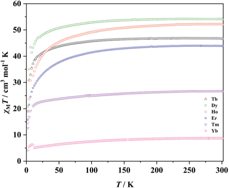 磁性材料在日常生活中的应用广泛,可用于电声、电信、电表、电机中,还可作记忆元件、微波元件等。在磁性材料的描述中,磁化率是用来表征磁性材料磁特性的重要参数。因此针对性提高磁性材料的磁化率,可以扩展或增强其应用。 与此同时,离子液体(ILs)是一类低温熔融盐,由于它们具有良好的物理化学特性,例如低蒸气压、高热稳定性、宽电化学窗口等,ILs在发现之后,在许多领域都引起了极大的关注。近来,在IL结构的阳离子或阴离子中掺入顺磁性组分产生的磁性离子液体(MIL)成为ILs功能材料研究的热点之一。1-甲基-3-丁基咪唑四氯合铁(III)酸盐([C4mim][FeCl4])是第一个磁性离子液体,随后,各种离子和稀土离子已被用作制备MIL的顺磁性中心。稀土离子的引入为解决含过渡金属离子的MIL的低饱和磁化问题提供了一种新方法。 基于此,3003新葡官方网站的沈兴海等人通过在IL的阳离子和阴离子中掺入镧系元素离子来制备MIL1-6(Ln=Tb、Dy、Ho、Er、Tm、Yb),实现了磁性材料磁化率的提高。