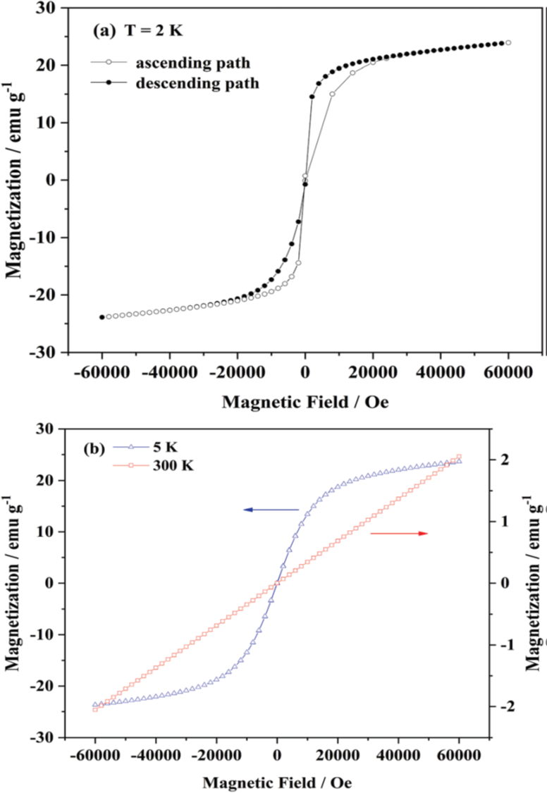所有样品在所研究的温度范围内表现出顺磁行为,并且在高温区域达到恒定的χMT值。随着温度的降低,特别是在较低的温度下,χMT值急剧下降,表明为反铁磁耦合。在室温下,MIL1-5的χMT值分别为46.7、54.2、52.2、43.9和26.7 cm3 mol-1 K。由于MILs中高浓度的磁性中心,其χMT比含有单个相应镧系离子的MILs高4倍,但低于阳离子中含有5个镧系离子的MILs。 图4. 2,5和300 K时MIL2的磁化强度的场依赖性图(M–H)