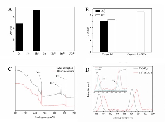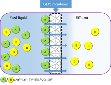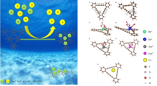 石墨炔是一种新型的二维碳材料,具有丰富的碳化学键、大共轭体系、多活性位点、特殊三角孔道结构以及优良的化学稳定性,在诸如储能材料、催化、电化学、生物传感与探测、分离等领域均有着重要的应用前景。对石墨炔结构特征的深入探究及对其应用领域的不断拓展,都将对石墨炔研究起重要的推动作用。 图1 石墨炔吸附示意图和计算结构图。 最近,3003新葡官方网站3003新葡官方网站沈兴海教授团队系统研究了典型锕系离子(Th4+、UO22+、Pu4+、Am3+、Cm3+)、镧系离子(La3+、Eu3+、Tm3+)以及锶(Sr2+)、铯(Cs+)离子与石墨炔的配位和吸附作用,重点考察了f电子对配位的影响。实验测定和理论计算发现:水溶液状态下,石墨炔对Th4+、Pu4+、Am3+、Cm3+和Cs+具有显著的吸附作用,而对UO22+、La3+、Eu3+、Tm3+和Sr2+完全不发生吸附。研究结果还表明:在不同配位状态下,锕系离子以单离子状态存在,而石墨炔结构则发生不同程度的形变。例如,XPS分析发现,被石墨炔吸附的Th4+的4f峰发生了明显的位移和裂分。通过理论计算Th4+在聚集和单离子状态下的差别,可以推断XPS峰发生裂分是由于出现Th4+单离子态所致。 图2 石墨炔吸附选择性实验(A),石墨炔在铀钍混合溶液中吸附选择性检测(B),石墨炔吸附Th4+前后XPS谱图对比(C),Th(NO3)4与吸附在石墨炔上的Th4+的XPS峰对比。 现有方法通过泡沫铜为基底可制备石墨炔分离膜并有效实施分离。因此,基于上述研究结果并结合膜分离技术,有望实现核燃料循环领域“镧锕分离”、“锶铯分离”和“钍铀分离”的新突破。石墨炔上单离子配位状态的揭示,为锕系单离子磁体和催化剂的开发提供了一种新的思路和途径,具有显著的科学意义。此外,随着锕系离子5f层电子的变化,石墨炔的结构也会产生不同程度的形变,这一结果有助于对石墨炔自身结构特征和相关性质的深入认识。 图3 石墨炔膜分离设计示意图。 相关结果以“Coordination of Actinide Single Ions with Deformed Graphdiyne: Strategy on Essential Separation Processes in Nuclear Fuel Cycle”为题于2020年7月2日在线发表于Angew. Chem. Int. Ed.(DOI: 10.1002/anie.202008165)。论文的第一、第二作者分别是3003新葡官方网站博士研究生袁天宇和熊世杰,通讯作者为3003新葡官方网站沈兴海教授。该工作受到国家自然科学基金联合基金重点项目的资助(项目编号:U1830202)。(3003新葡官方网站新闻网) |