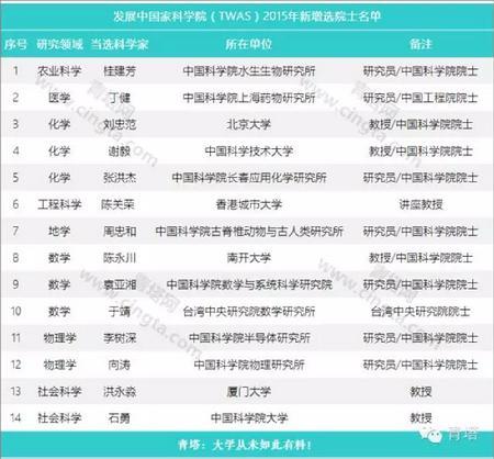 重磅:14位中国学者当选发展中国家科学院院士!2015-11-20 有料的大学新媒体 青塔 日前,发展中国家科学院(TWAS)第26届院士大会在奥地利首都维也纳开幕,这是TWAS成立32年来首次在意大利总部以外的发达国家举办大会。这次的大会上,奥地利总统Heinz Fischer,奥地利副总理兼科学、研究与经济部部长Reinhold Mitterlehner以及全球60多个国家和地区的300多名科学家、10余个国家的科技部长及其代表以及国际组织代表参会,共同关注科技助力全球可持续发展。 在此次院士大会中,经TWAS提名委员会提名、全体参会TWAS院士选举通过,白春礼连任TWAS院长,任期为2016至2018年。白春礼于2013年1月就任TWAS院长,是该组织成立以来担任院长职务的首位中国科学家。本次发展中国家科学院院士大会共增选了44名发展中国家科学院院士,其中巴西有3人当选,印度有12人当选,美国有3人当选,中国本届新当选了14名发展中国家科学院院士,新当选的院士人数位居全球第一。