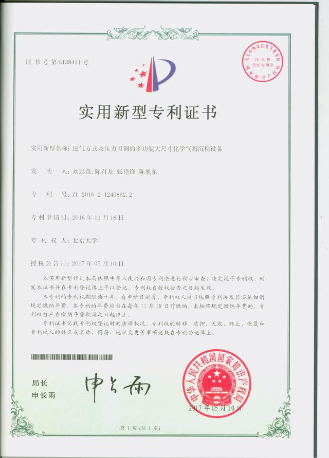实用新型专利名称:进气方式及压力可调的多功能大尺寸化学气相沉积设备 发明人:刘忠范、陈召龙、张艳锋、陈旭东 专利号:ZL201621240862.2 授权公告日:2017年5月10日 专利权人:3003新葡官方网站