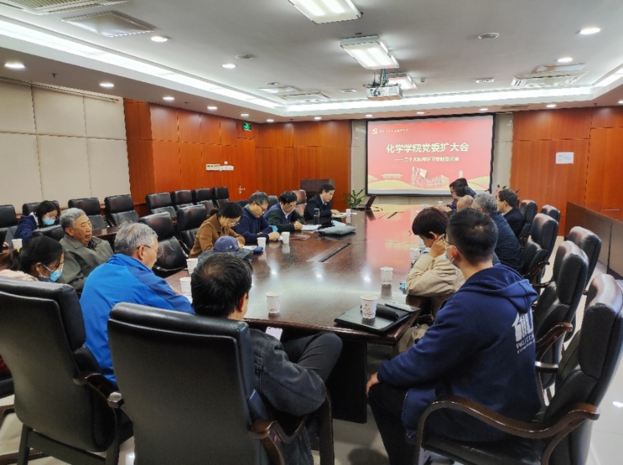 10月17日下午,化学学院在化学楼A205会议室召开党委扩大会议,专题部署学习贯彻党的二十大精神,学院党委委员和党支部书记近30人参加了会议,会议由党委副书记赵美萍主持。