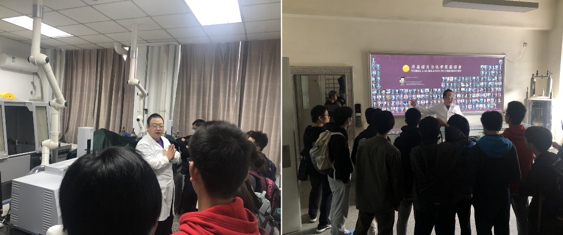 然后,马锴果老师向同学们重点介绍了基础仪器实验室的粉末X射线衍射仪和气相色谱-质谱联用仪等教学仪器,从农药残留和药品质检等与生活密切相关的事件出发,介绍了化学在物质检测方面的应用。随后,马老师还带领同学们参观了历届诺贝尔化学奖获得者展板和元素周期表实物展窗。