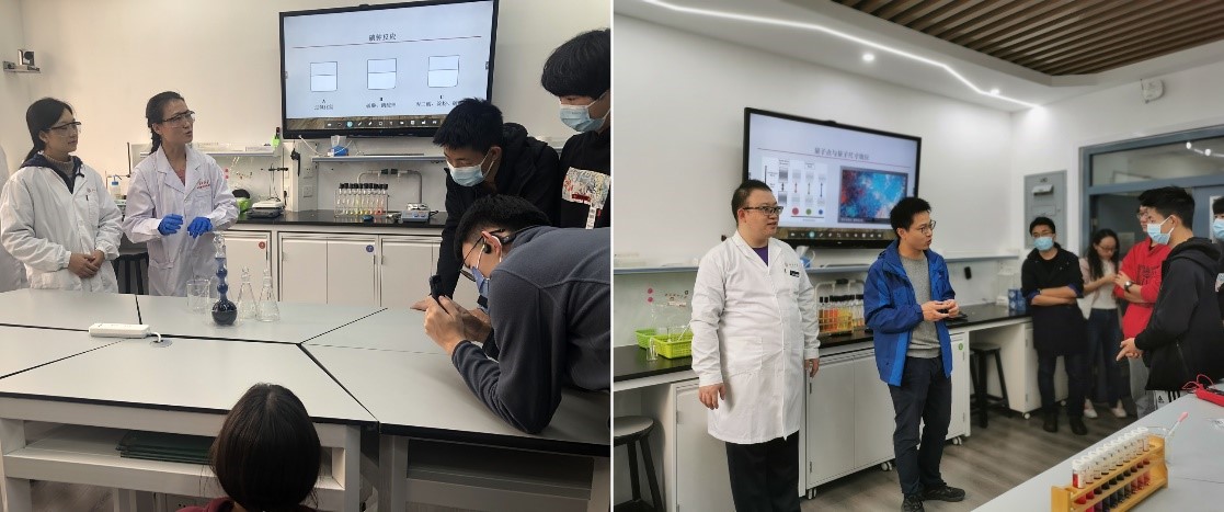 在活动后半程的科普演示实验环节中,贾莉、李田、赵浩和马锴果四位老师演示了碘钟反应、染料敏化太阳能电池、银纳米晶、碲化镉量子点等实验,深入浅出地介绍了非平衡态热力学、能源化学和纳米化学等相关知识。