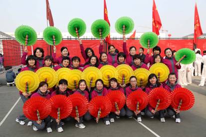 此外,在田芝莉、关妍和仲秋等老师的耐心细致地指导下,我院24名女职工参加了开幕式上“大地迎春”团体操表演。由于多年以来的出色表现,我院队伍被安排在整个表演队伍的中间位置。在团体操表演中,伴随着优美的旋律化学学院的老师们和来自全校不同单位的1000多名职工一道,翩翩起舞,花扇在手中上下翻飞,红黄粉绿次第绽放,赢得现场观众的阵阵掌声。