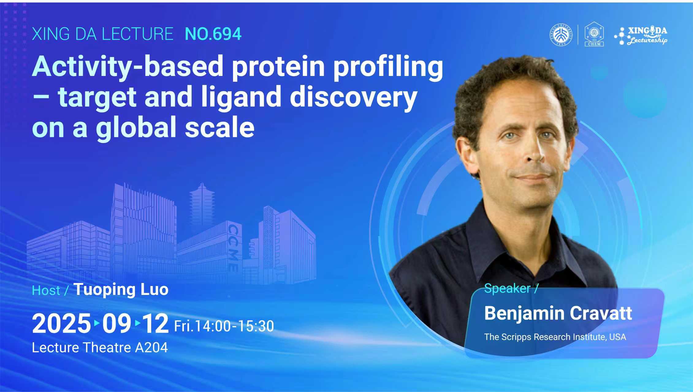 Dr. Cravatt is Professor and Norton B. Gilula Chair of Chemical Biology in the Department of Chemistry at The Scripps Research Institute. His research group is interested in developing chemical proteomic technologies that enable protein and drug discovery on a global scale and applying these methods to characterize biochemical pathways that play important roles in human physiology and disease. Dr. Cravatt obtained his undergraduate education at Stanford University, receiving a B.S. in the Biological Sciences and a B.A. in History. He then received a Ph.D. from The Scripps Research Institute (TSRI) in 1996. Professor Cravatt joined the faculty at TSRI in 1997. Dr. Cravatt is co-founder of several biotechnology companies, including Activx Biosciences, Abide Therapeutics, Vividion Therapeutics, and Belharra Therapeutics. Dr. Cravatt’s honors include the Eli Lilly Award in Biological Chemistry, the ASBMB Merck Award, AACR Award for Achievement in Chemistry in Cancer Research, the Wolf Prize in Chemistry, the Heinrich Wieland Prize, and memberships in the National Academies of Inventors, Medicine, and Sciences.