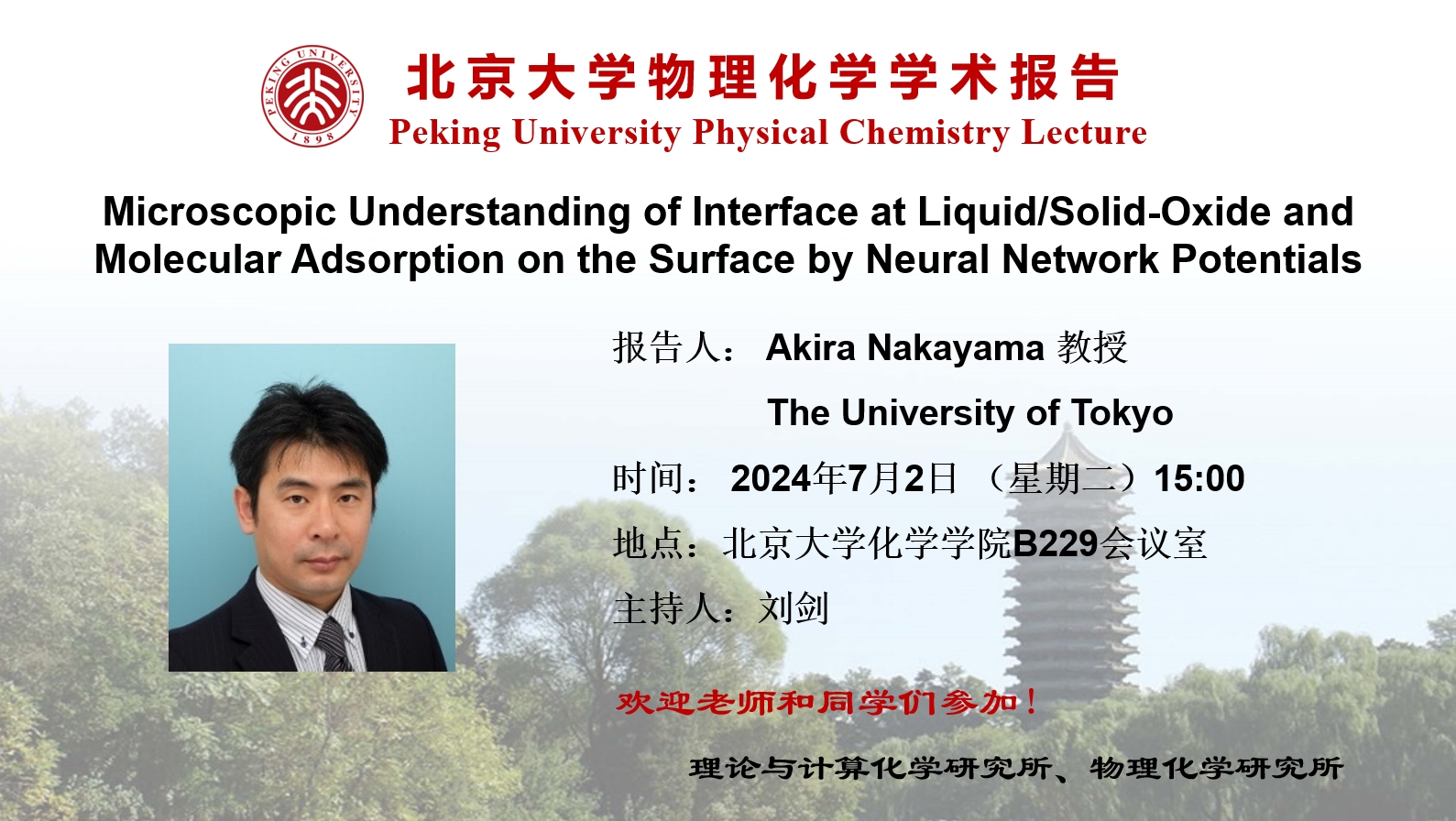 【3003新葡官方网站物理化学学术报告】Microscopic Understanding of Interface at Liquid/Solid-Oxide and Molecular Adsorption on the Surface by Neural Network Potentials