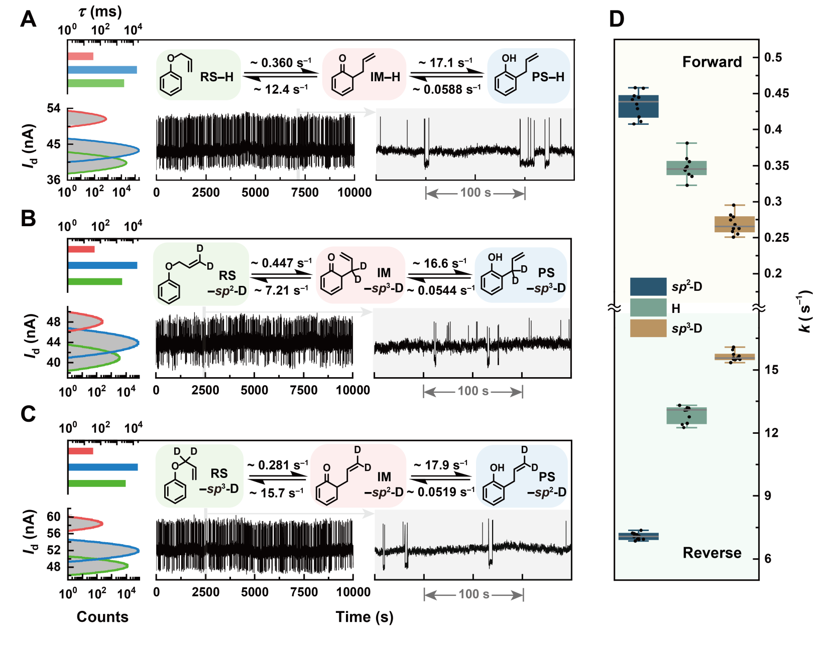 Xuefeng Guo group from Peking University focuses the study on single-molecule reaction dynamics for a long time. Together with their collaborators, they have revealed new mechanisms and novel phenomena that are hidden by ensemble averages. Recently, they used Claisen rearrangement as a model reaction, and measure KIEs by monitoring the I−t curves of different types of deuterated substrates (allyl phenyl ethers sp2-D (deuterium connected to sp2 C) and sp3-D (deuterium connected to sp3 C)) to obtain the rates of the rearrangement and the proton shuttle processes (the Butterworth filtering method was used to distinguish signals), which indicates the concerted but asynchronous mechanism of 3,3 σ-migration (Fig. 2).
