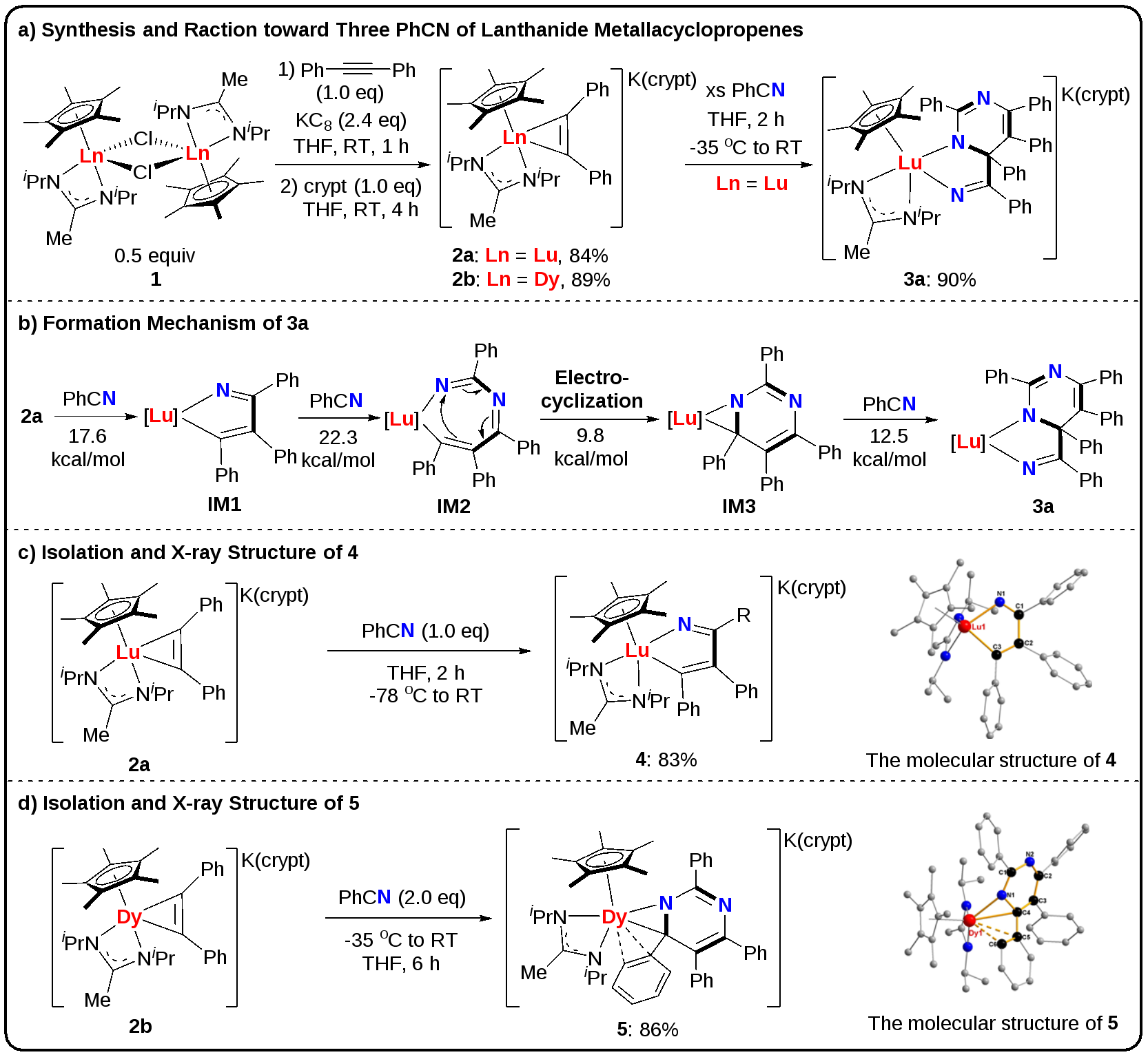 Nitriles are key synthons of N-heterocycles, and their reaction with metallacyclepropenes is one of the most important reactivities of metallacyclopropenes. However, the large steric hindrance on the metal center results in the limited reactivity of the scandacyclopropenes. Since lanthanides possess larger ionic radii than scandium, they subsequently synthesized two lanthanide metallacyclopropenes: lutetacyclopropene 2a and dysprosacyclopropene 2b. The selective coupling of 2a and three molecules of PhCN provides an unexpected fused lutetacycle 3a with one 1,6-dihydropyrimidine ring (Fig. 2a). Mechanistic studies by in situ NMR spectra and DFT calculations reveal that the formation of 3a proceeds through four key steps: the insertion of the first PhCN into 2a giving azalutetacyclopentadiene IM1, the insertion of the second PhCN into the Lu−N bond of IM1 providing an unsymmetric seven-membered lutetacycle IM2’, the intramolecular 6π electrocyclization of IM2’ furnishing a highly strained η2-pyrimidine metallacycle IM3’, and the insertion of the third PhCN into the Lu−Csp3 bond of IM3’ affording 3a (Fig. 2b). Furthermore, they successfully isolated azalutetacyclopentadiene 3 (i.e. IM1) through the reaction between 2a and one equiv of PhCN at low temperature (Fig. 2c), and obtained the η2-pyrimidine dysprosacycle 4 (i.e. the analog of IM3’) from 2b and two equivalents of PhCN (Fig. 2d). The isolation and characterization of 3 and 4 not only suggest the mechanism of 6π electrocyclization of diazametallacycloheptatriene IM2’, but also offer a new insight into metal-catalyzed [2+2+2]-cycloaddition. The reactivity chemistry of lutetacyclopropene 2a is significantly different from these metallacyclopropenes of scandium and other metals. Theoretical investigations imply the more polarized and ionic nature of the Lu−Csp2 bonds in lutetacyclopropene than the Sc−Csp2 bonds in scandacyclopropene, and this indicates the higher reactivity of lutetacyclopropene. Besides, ion radii of Lu3+ (0.977 Å) and Sc3+ (0.870 Å) may also play an important role in reactivity.